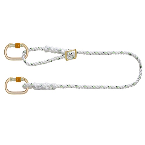 Made up of 14mm dia polyamide 3-strand twisted rope. Manual Ring-type adjuster of forged alloy steel. Maximum length is 2.0 m. Easy to connect Steel Karabiners (PN 112) at both the ends for attachment.